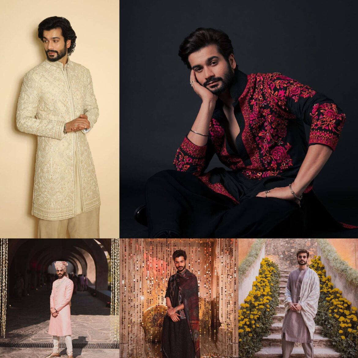 A black kurta with red floral details is a timeless combination that never fails. Sunny’s take on this classic colour pairing is perfect for evening festivities. The subtle yet striking floral accents make this look a perfect choice for men who want to keep it simple yet stylish for nighttime events.